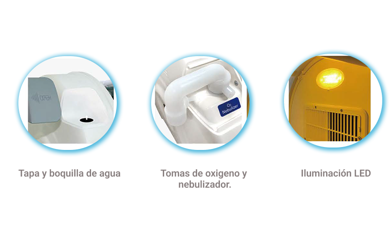 Conexiones para oxígeno, nebulizador y ventilación especializada.